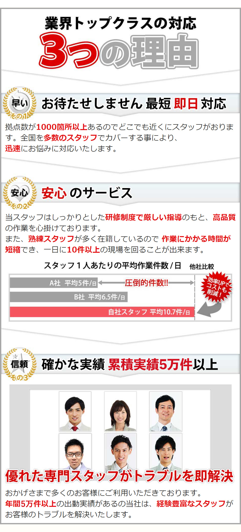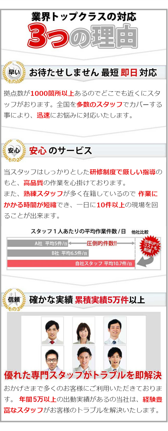 弊社は全国各地に拠点を設けており、お客様のお近くの作業員を手配する事が可能となっておりますので即日でも対応する事は可能です。ただ、 その日のスケジュールによっては翌日以降となってしまう場合もありますので、出来る限り早めのご連絡をお願い致します。